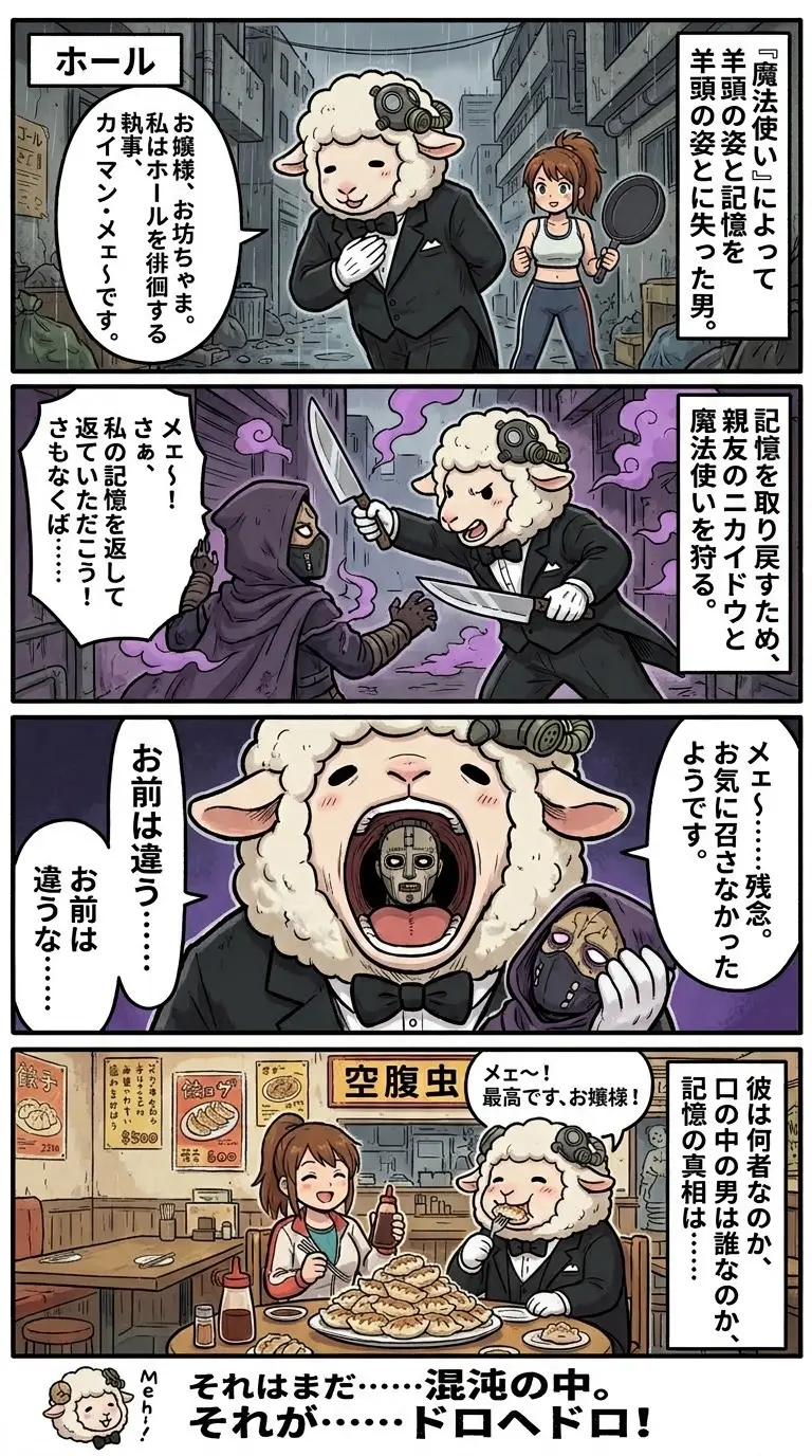 彼女が作る大好物のギョーザを頬張りながら、カイマンは魔法使いの頭を文字通り口の中に咥え込み、中の男に問いかけます。
