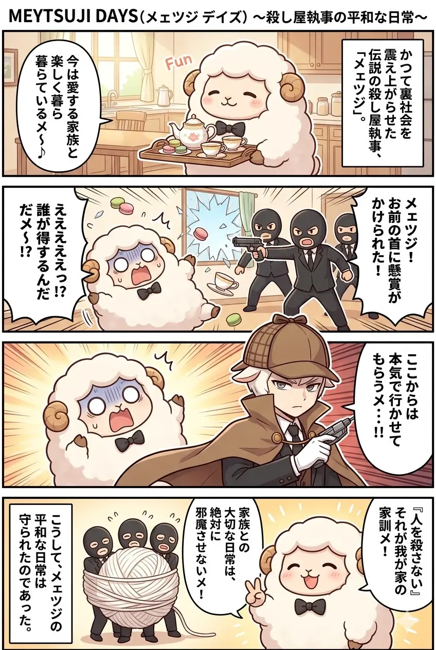 「伝説の殺し屋が、愛する人のために引退して太っちゃった」という衝撃の設定。でも、いざ戦いとなるとキレッキレ……。このギャップに、世界中のファンがシビれているんですメェ!